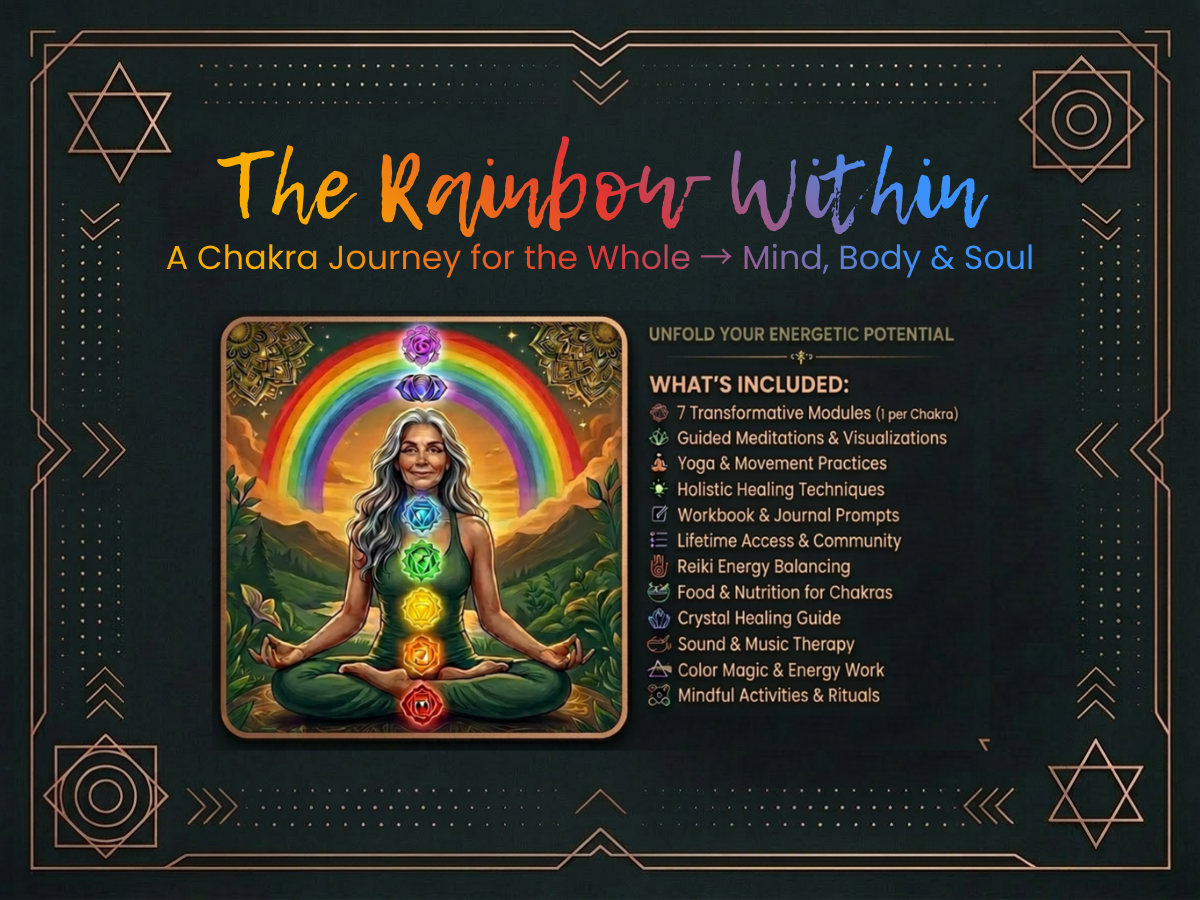 This 7-week guided journey takes you deep into the chakra system - blending meditation, Reiki, nutrition, color magic, and more. Each week you’ll focus on a single chakra, exploring its wisdom through lessons, practices, and rituals that bring balance to your entire being. Whether you’re brand new to chakras or ready to deepen your practice, this course will help you align, expand, and embody your brightest Self.